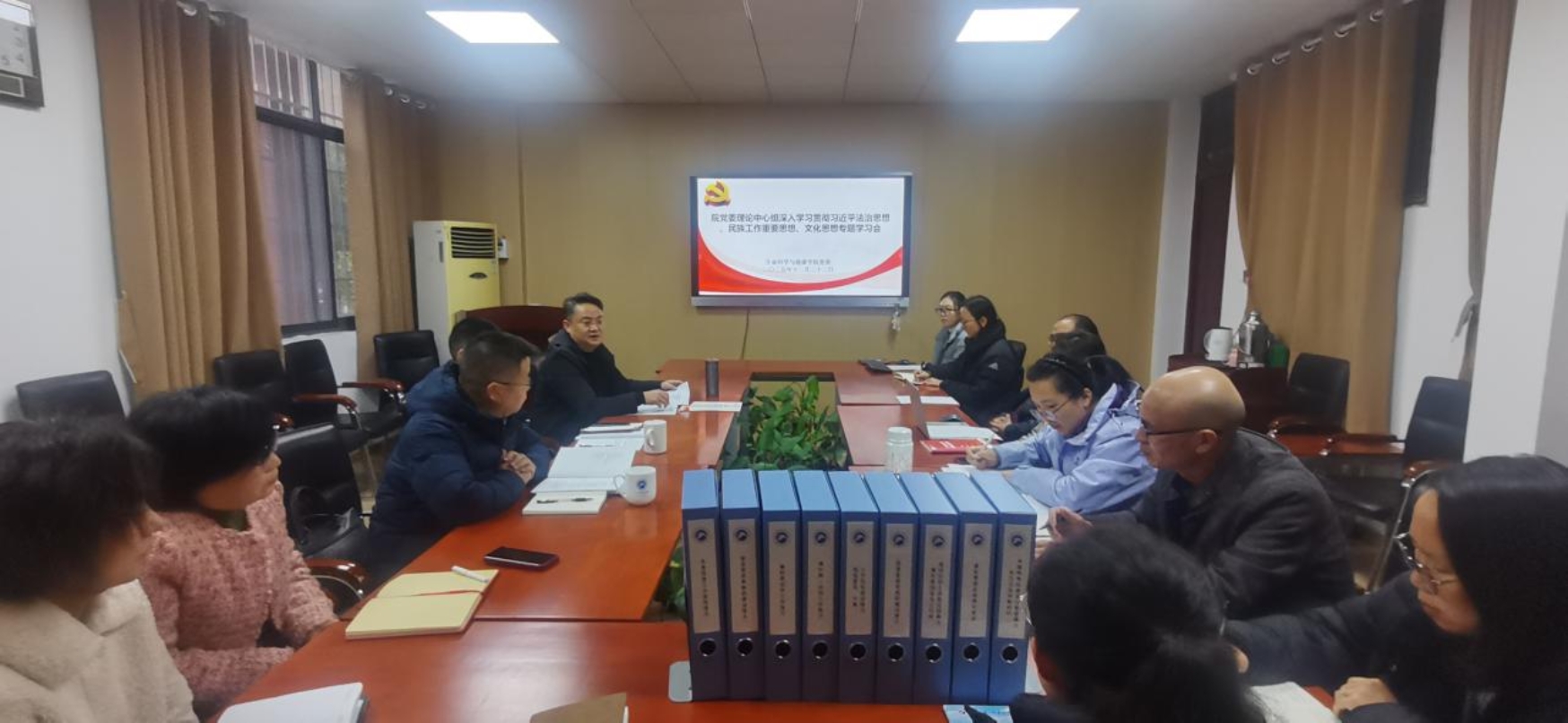 12月22日上午,无码av影片 党委理论学习中心组在生物楼110会议室举行2025年第12次集体学习,专题学习习近平法治思想、习近平总书记关于加强和改进民族工作的重要思想以及习近平文化思想。无码av影片 党委书记龙赢主持学习会,党委理论学习中心组成员、三办主任、各系部负责人、教工党支部书记、组织员等参加学习。