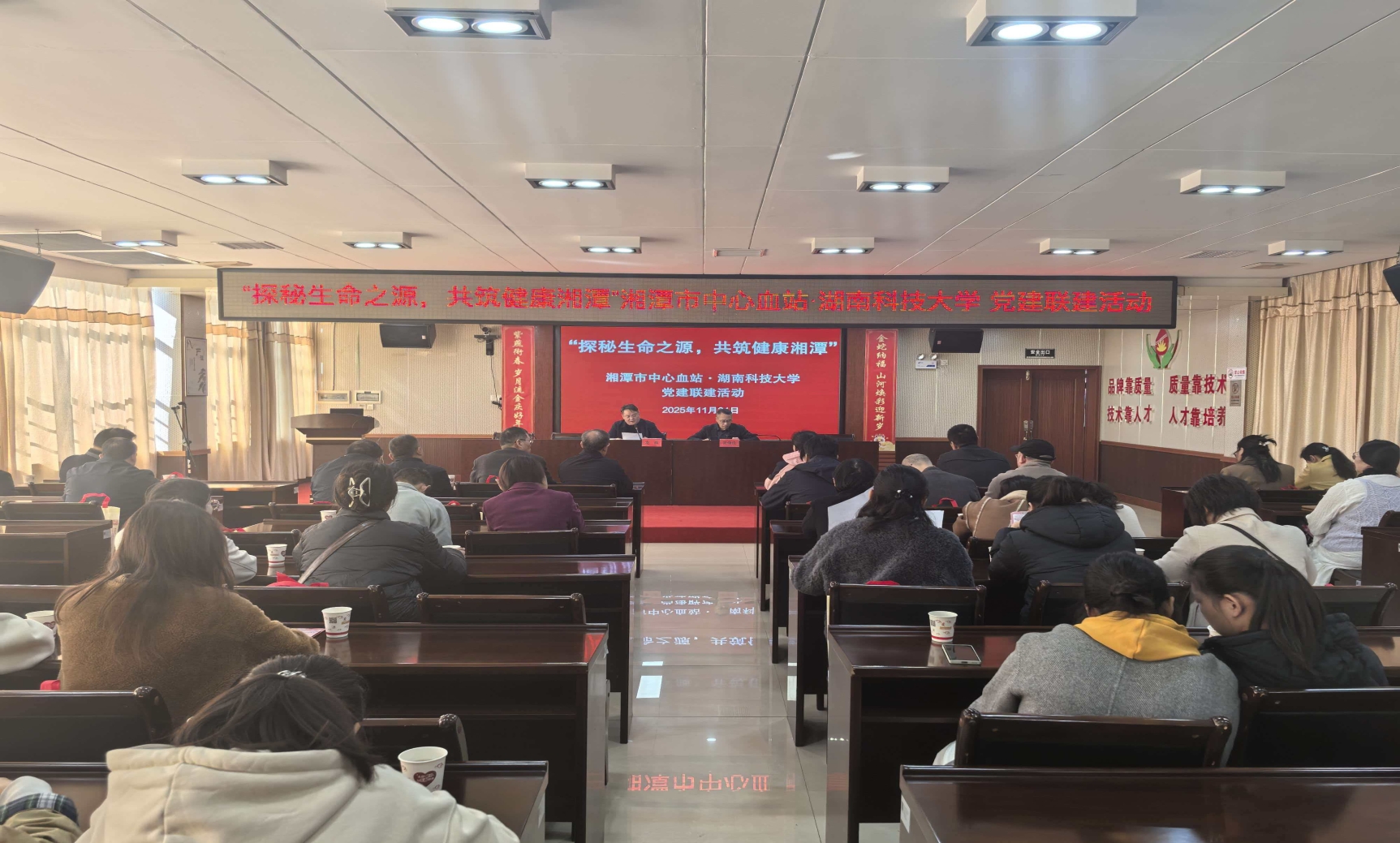 11月21日,无码av影片 与湘潭市中心血站开展党建联建活动,通过理论学习、科普宣讲与实践参观相结合的方式,推动无偿献血公益事业与高校思政教育深度融合。市中心血站党总支书记张俊良,无码av影片党委书记龙赢、党委副书记舒艳及无码av影片 师生党员代表出席本次活动。