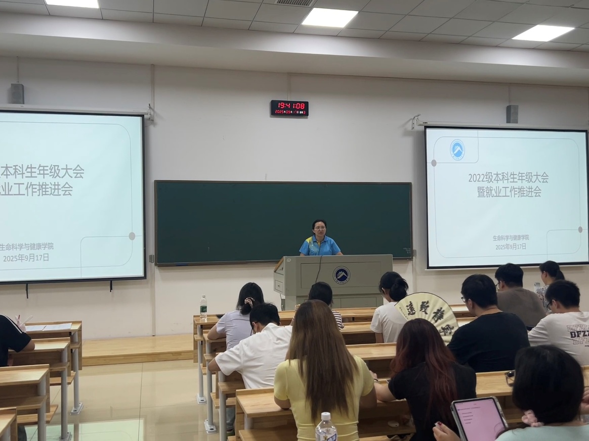 为扎实推进2022级本科生毕业季学业规划与就业指导工作,9月17日晚7点半,无码av影片于敏行楼C512召开年级大会暨就业工作推进会。会议由2022级辅导员易临群主持,无码av影片 党委副书记舒艳出席并讲话,全体2022级本科生参会。