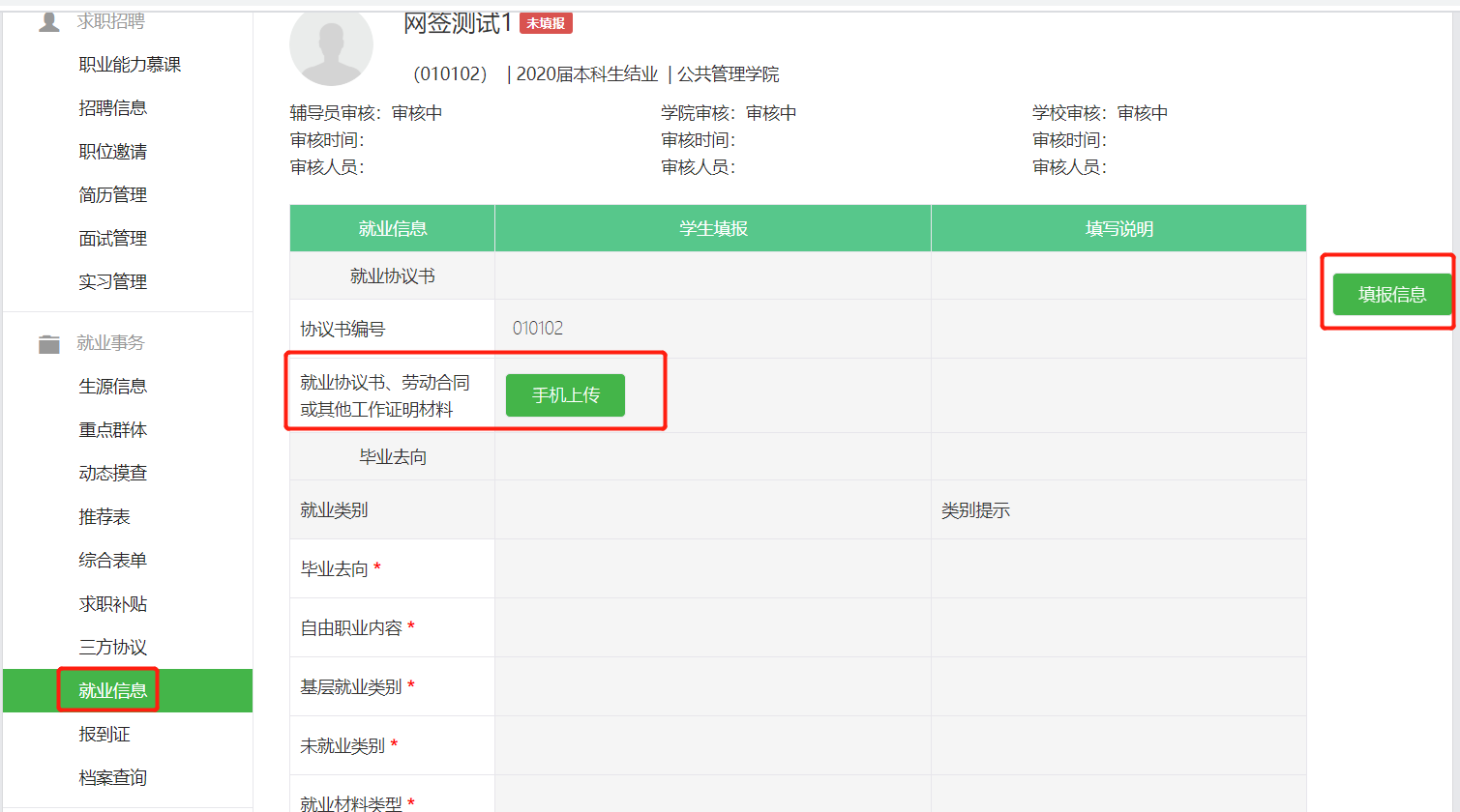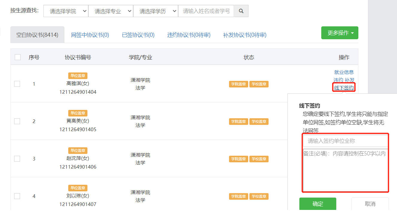 ②学生必须要有协议书编号(一般协议书编号会统一导入,如有个别学生无协议书编号,可以在“就业信息”——更多——领取协议书中填入协议书编号)