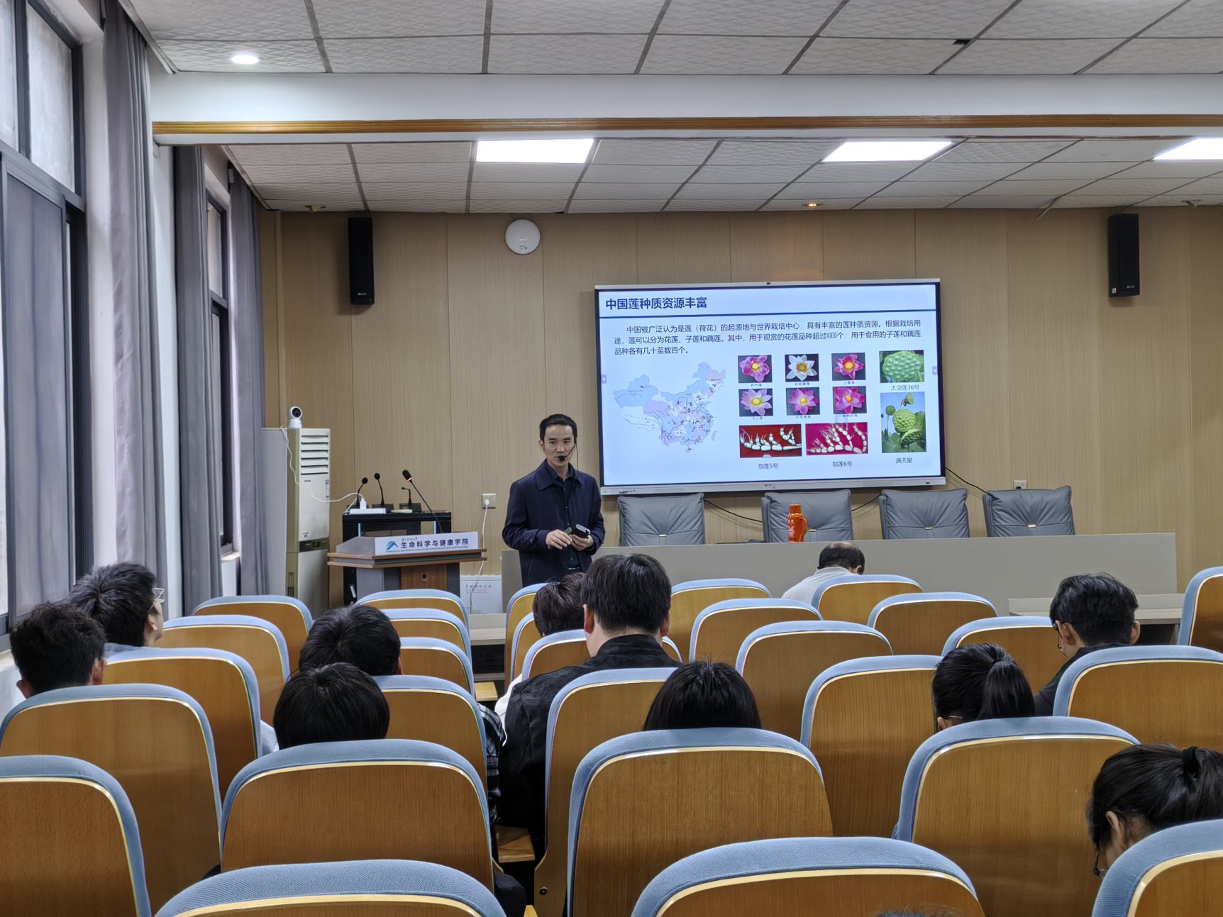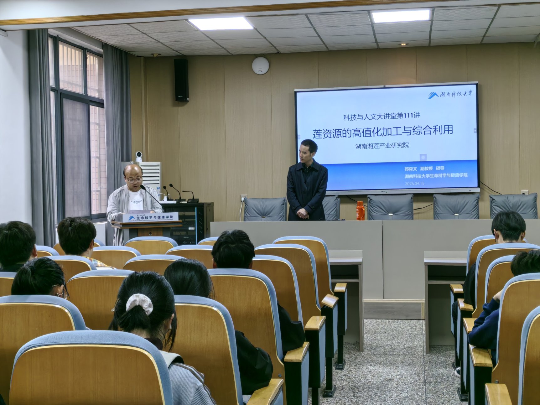 4 月 15 日下午4:00,无码av影片 科技与人文大讲堂第 111 讲“莲资源的高值化加工与综合利用”在生物楼 105 开讲。本次讲座由无码av影片 邓森文副教授主讲,副院长李彪主持,全院师生代表观摩学习。