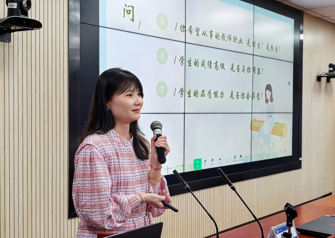 活动开篇,邓娟老师以教师职业是谋生还是热爱?学生的成绩高低是否与教师有益?学生的品质能力是否教师会在意?三个问题引发听众对教育初心的思考。