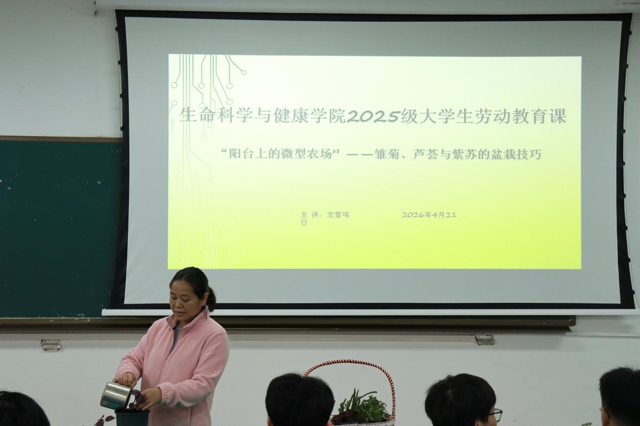 4月21日14:00,无码av影片 2025级大学生劳动教育课在八教103正式开讲。25级辅导员龙雪鸣老师担任主讲,以“阳台上的微型农场”为主题,围绕雏菊、芦荟与紫苏的盆栽技巧展开教学,带领同学们现场边学边做,完成了一场从“植物盲”到“生活家”的劳动实践。